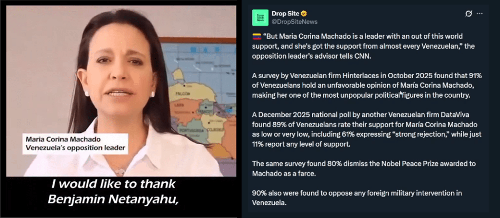 Może dziwić, że marionetkowa noblistka Machado została na razie zupełnie pominięta w rozgrywce, ale to zapewne rezultat jej fatalnego postrzegania w Wenezueli (ponoć 80%+ ludzi jest negatywnie nastawionych). Aktualna wiceprezydent Rodríguez została zaprzysiężona, ale nadal wypowiada się, podobnie jak wojskowi dowódcy, dość buńczucznie wobec dyktatu Trumpa. Piątego stycznia w Caracas miały też miejsce strzelaniny, a chavistowskie bojówki rozstawiły punkty kontrolne. Tak więc dalszy rozwój wypadków bynajmniej nie jest klarowny.