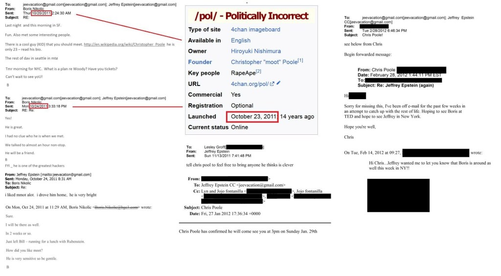 Epstein mógł mieć coś wspólnego z rozkręceniem politycznego skrzydła 4chana. Podkategoria „/pol/” 4chan została stworzona dzień po tym jak E. spotkał się z założycielem forum (m00t, Christopher Poole). To było epicentrum, z którego rozlało się później skrajnie prawicowe i incelskie bagno.