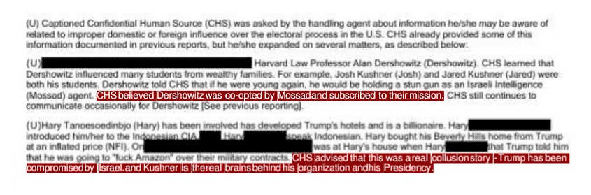 Ponoć FBI dostało informację od zaufanego źródła osobowego, że Trump jest narażony na szantaż ze strony Izraela, a Dershowitz został zwerbowany przez Mossad i wraz z Kushnerem prał pieniądze.