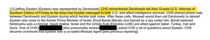 …dodatkowo Acosta (ówczesny prokurator generalny USA) dostał informację, że E był agentem „sprzymierzonego wywiadu”, wiec tym bardziej musiał dostać leciutki wyrok w 2007 roku, w czym pomagał bezpośrednio Dershowitz (prywatny prawnik zarówno T jak i E).