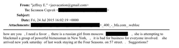 Epstein zwrócił się do Siergieja Bielakowa (ówczesnego wiceministra gospodarki / rozwoju Rosji) z prośbą o pomoc w powstrzymaniu Rosjanki przed „szantażowaniem” grupy „nowojorskich biznesmenów” w 2015 roku.