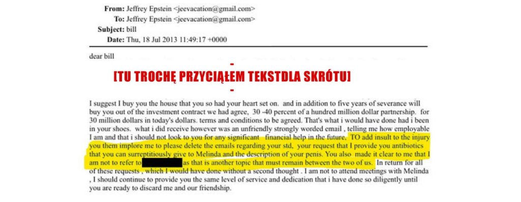 Epstein najpewniej szantażował Billa Gatesa, a na pewno się do tego szykował. Gates miał mieć się zarazić weneryczne od kontaktów z rosyjskimi dziewczynami, a E. załatwiał mu leki, których chciał między innymi używać na swojej żonie, żeby ta się nie zorientowała.