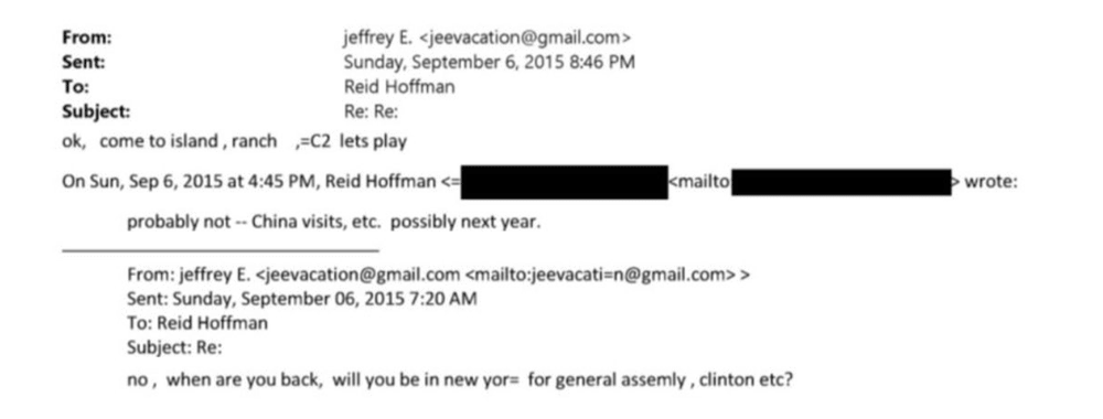 Reid Hoffman, wielki donator demokratów i przedsiębiorca internetowy (PayPal, Microsoft, OpenAI, etc.) w korespondencji sugerującej, że wizytował E. na wyspie / ranczu.