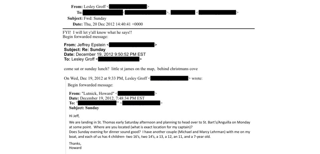 Lutnick (sąsiad E., finansista i współpracownik T z pierwszej kadencji) twierdził, że tylko raz odwiedził E w jego domu (2005), po czym stwierdził z żoną, że to ohydny człowiek i szantażysta, więc nie utrzymywali dalszych kontaktów. Tymczasem w 2012 był na jego wyspie, a do tego raportował jakie dzieci tam ze sobą przywiezie, łącznie z podawaniem ich wieku (ósemka dzieci od 7 do 16 lat). Teoretycznie mogą być to ich rodzone dzieci (jedzie z nimi też inna para), ale nie wiem czy na tę wyspę ktoś przyjeżdżał z potomstwem.