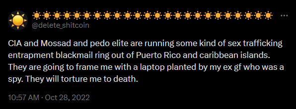 Deweloper kryptowalutowy Nikolai Mushegian pomieszkiwał sobie na Puerto Rico i Florydzie. Pewnego dnia na Twitterze napisał, że CIA, Mossad i pedofilska elita prowadzą z Puerto Rico i wysp karaibskich jakąś siatkę szantażową zajmującą się handlem ludźmi w celach seksualnych.