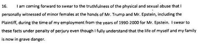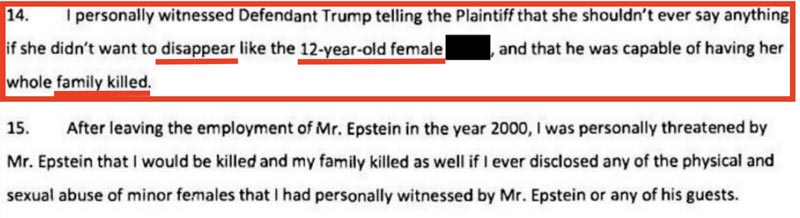 Świadek zeznała pod przysięgą, że Trump groził młodej dziewczynie, że może ją „zniknąć” wraz z rodziną, tak jak się to stało z inną 12-latką. Za fałszywe zeznania grożą lata więzienia. Tutaj skrót w The Times.