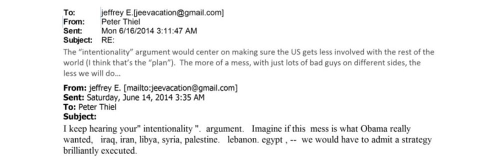 Epstein i Thiel omawiają strategię międzynarodową USA, gdzie celem jest sianie konfliktów i tworzenie podziałów, co wzmacnia rolę USA bez konieczności bezpośredniego zaangażowania (przynajmniej póki inni najpierw się nie wykrwawią).