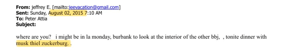 2015, E. miał być na kolacji z Zuckenbergiem, Muskiem i Thielem.